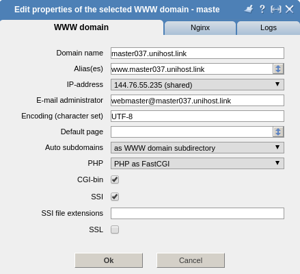 - Default page. Enter the name of your main page (e.g., index.php). If you do not fill in the field index.html page will be used by default.